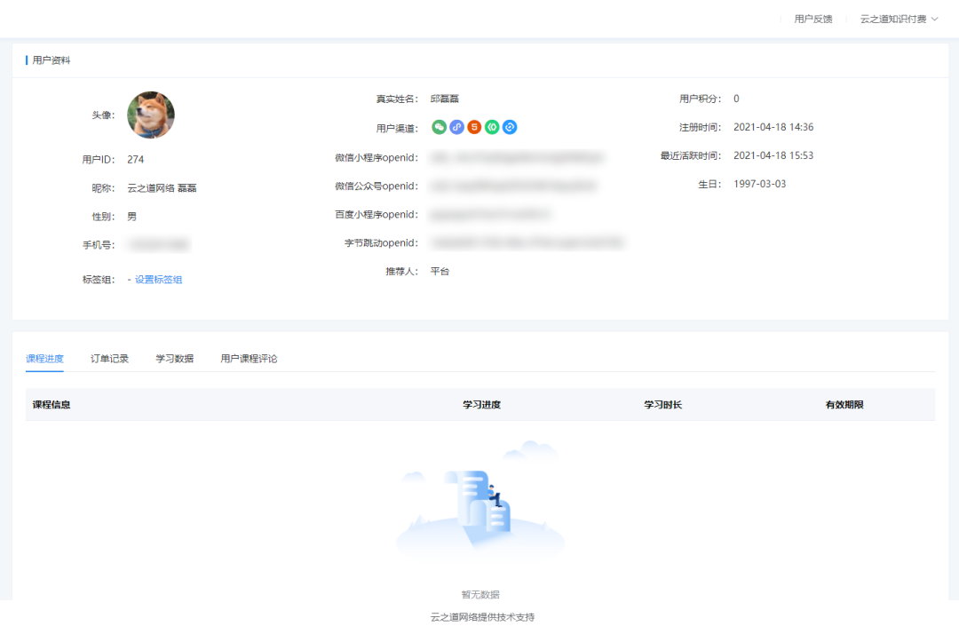 云之道知识付费V2用户账号体系新升级,多端在一个后台操作,内容同步,用户数据同步。绑定手机号后,可识别用户唯一身份,仅用微信小程序和微信公众号可以用微信开放平台打通用户数据,使用其他多端(H5、百度小程序、字节跳动小程序)后台可开启全端手机号打通,即在用户发生用户行为时触发登录和绑定手机号。